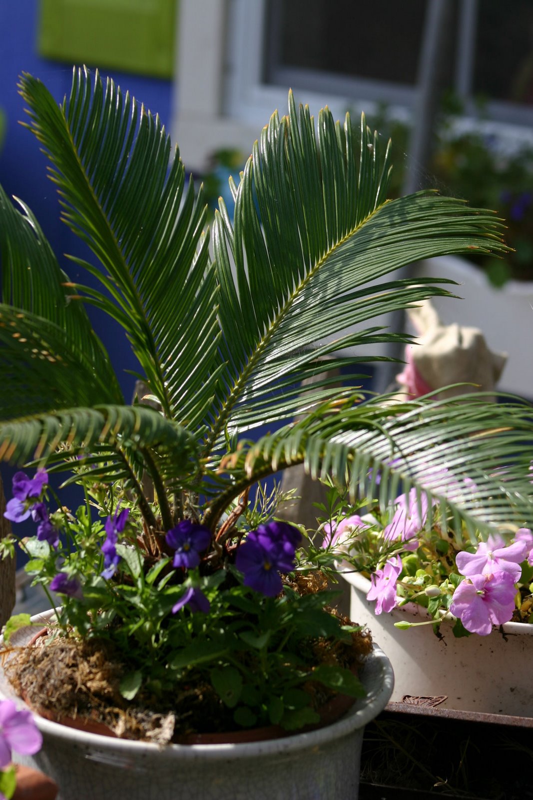 Some very welcome johnny-jump-up volunteers in the potted palm.