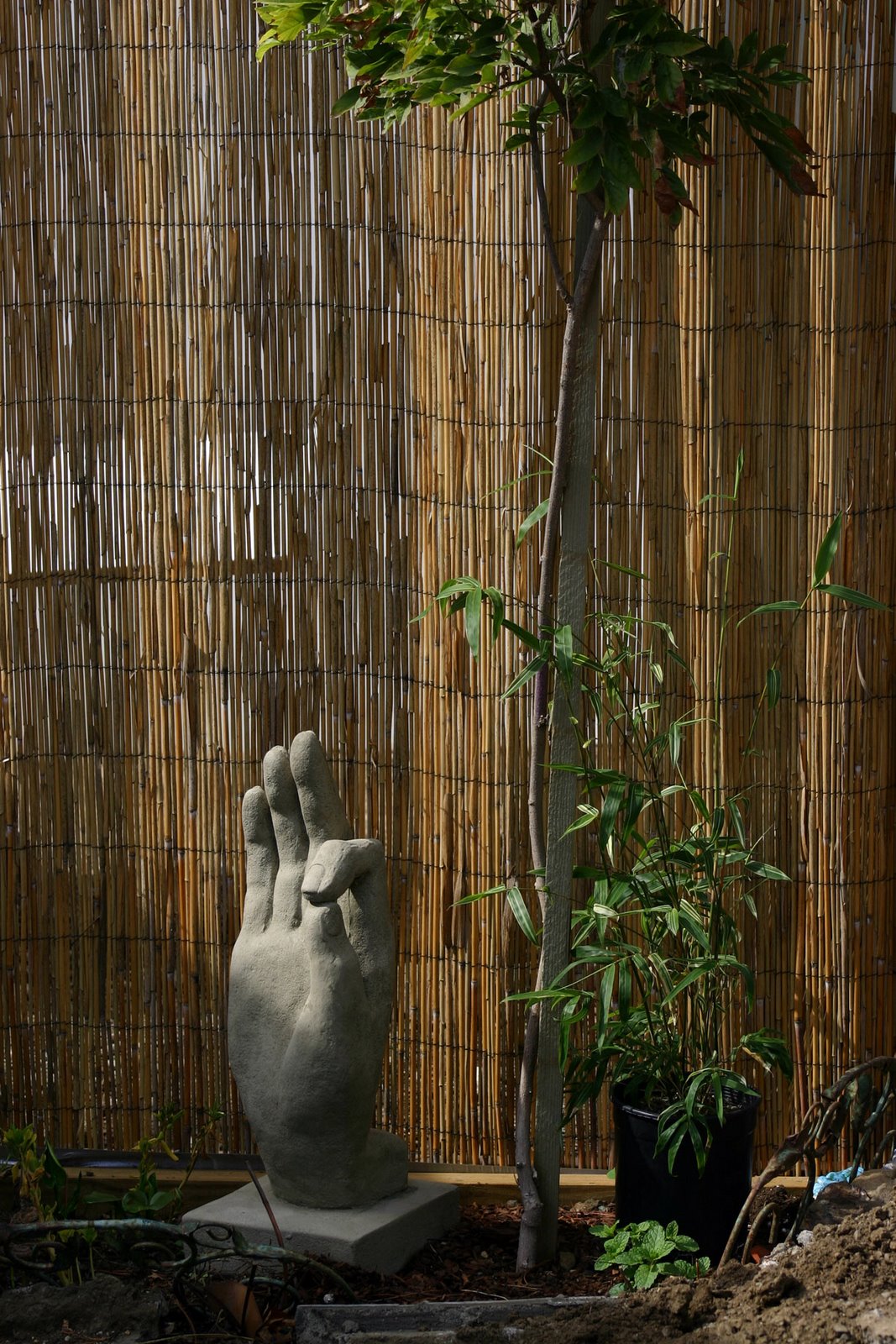 Scottie went ahead and put the bamboo in the ground since it seems to like that spot well enough. I’m thrilled to see the white canna lilys coming up in that bed as we have a gorgeous display every spring but they’re on the side of the house no one sees. I’m always amazed at how many come up and how beautiful and hearty they are.