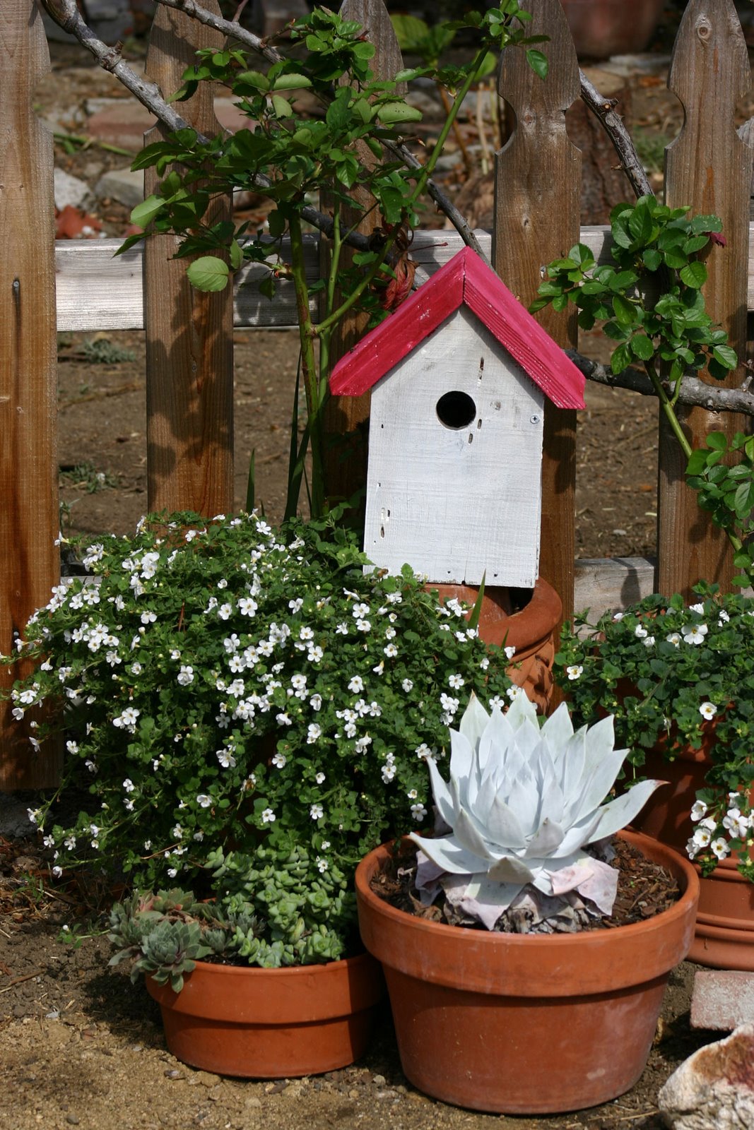 My little trouble spot by the arbor in the central garden got camouflaged with some pots and a freshly painted birdhouse. The roses we dug up and put in those pots are looking spectacular. All have buds.