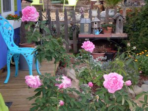 Mary Rose, or it could be Evelyn is blooming in the central garden as are the old pink rose and the pink sage in the little basket garden (see below). One day it’s warm and sunny and the next it’s almost freezing but the roses don’t seem to care. On and on they go.