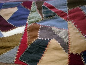 It is a marvel. I can identify a few stitches but most are new to me. I’ve been studying on it. Trying to figure out how some of them were done but I have a feeling many of them were made up as they went along. Compound stitches. They stitched along and thought maybe they’d add this one to that one and see how it looked. They used superior thread because none of it is damaged while some of the fabric has frayed badly. Some one’s pants or jacket. I’m certain not one bit of the fabric used was bought for the purpose of making a quilt.