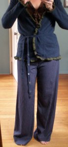 a merino wool polo. I used the bottom portion to make the ruffle around the edges and sleeves. It’s dreamy soft. The pants are made from another thrift store score.