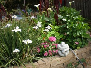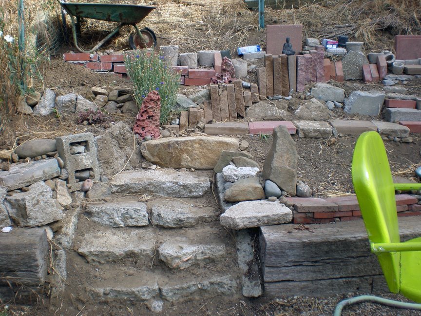 the monk also made an appearance and this year’s project was a rock garden. he got to work soon after arriving gathering all the stones and broken pavers he could find in our yard and built his little “ruins” rock garden up on the hillside ….