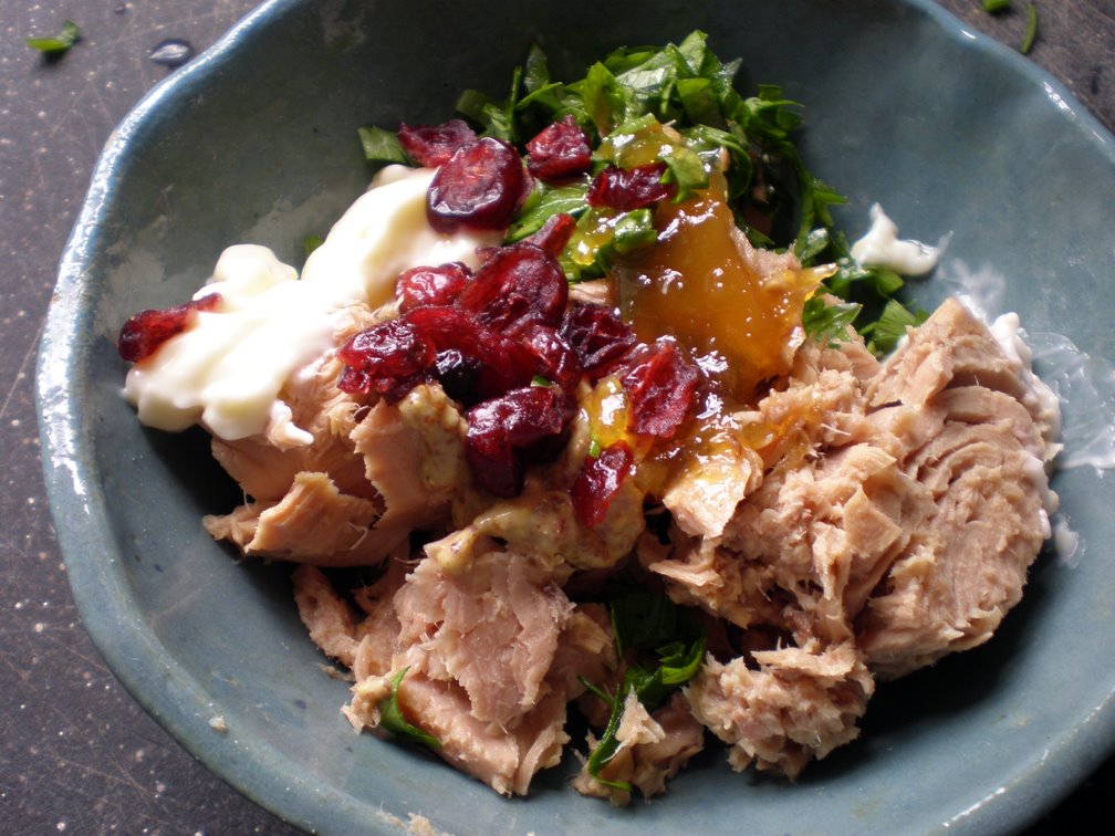 ingredients for the patty melt are: tuna in spring water, dried cranberries, mango chutney, mayo, mustard (the good kind with seeds in it), parsley from the garden, green onions and provolone cheese. grill on stove with lots of butter.