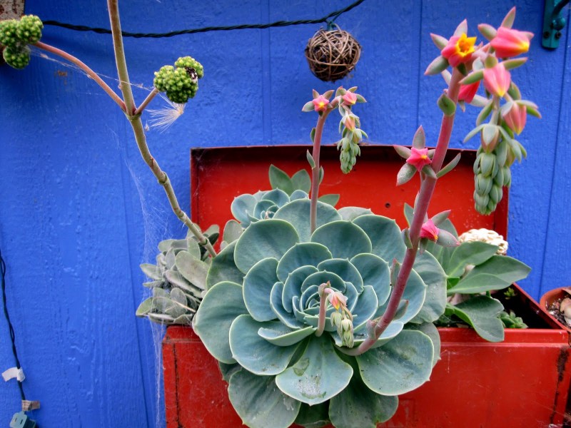 The tool box is in bloom as are all the succulents I transplanted from various cuttings gathered around town. These things are remarkably easy to propagate and basically carefree. They could use a bit of a clean up, note the spider web and seed head perched on the left.