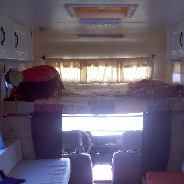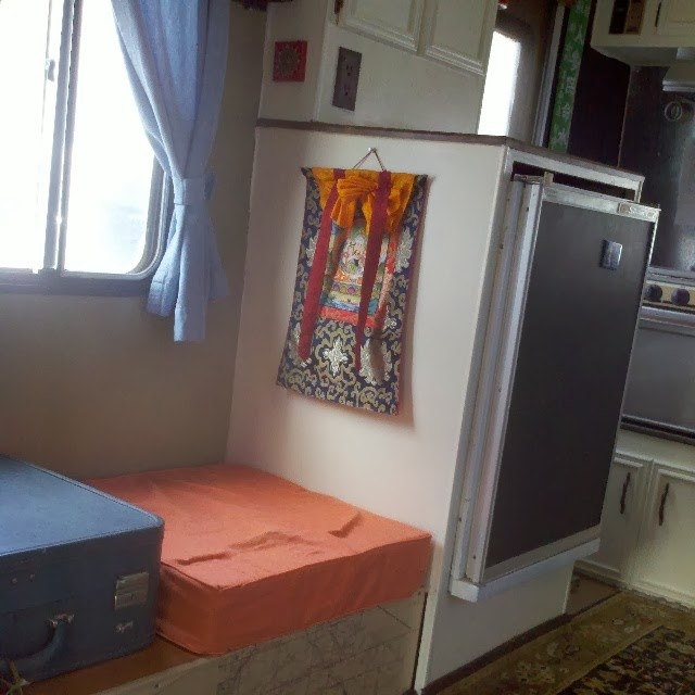 Found the curtains at Goodwill, cut and hemmed them and used the tabs as ties. Got new foam for the bench and recovered in canvas tarp.