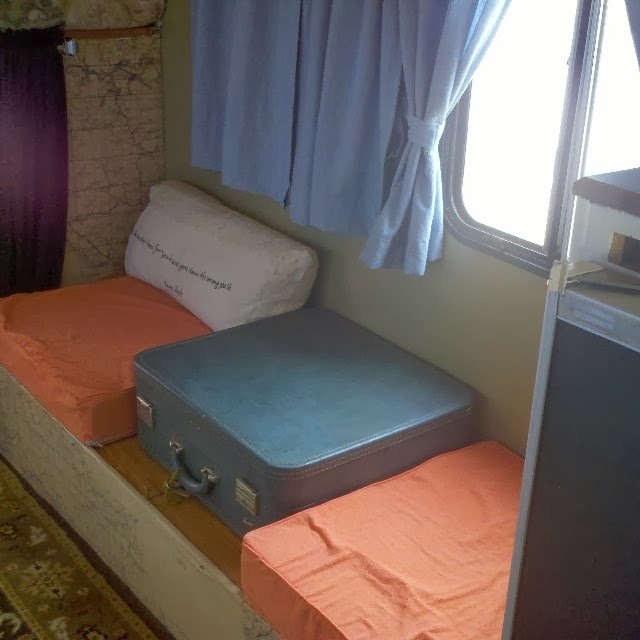 A temporary measure. We removed the chairs and tiny table and replaced with suitcase and pillows but it’s just not working for me.  I didn’t finish the pillows properly as I rushed to get it ready for Tearful and I didn’t yet have the legs for the suitcase “table”. I’ll be putting them on today. I’m counting on a brainstorm to hit sometime soon.