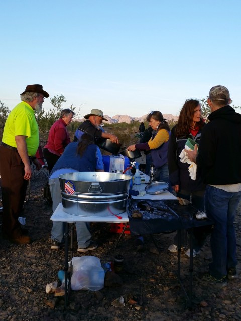 Drove the 6 or 7 miles to the laundromat where you can also have a shower and eat breakfast whilst your clothes become clean for around $3 and where you can listen to conversations about 6 volt vs 12 volt batteries for you rig. I rode my bike around town for a bit but hurried back to camp after stocking up on water and ice. There are seminars every morning and organized (and unorganized) get togethers. Tonight was a very well organized chili dinner. Everyone brought something to add to the pots of beef, vegetarian and vegan(?) chili.