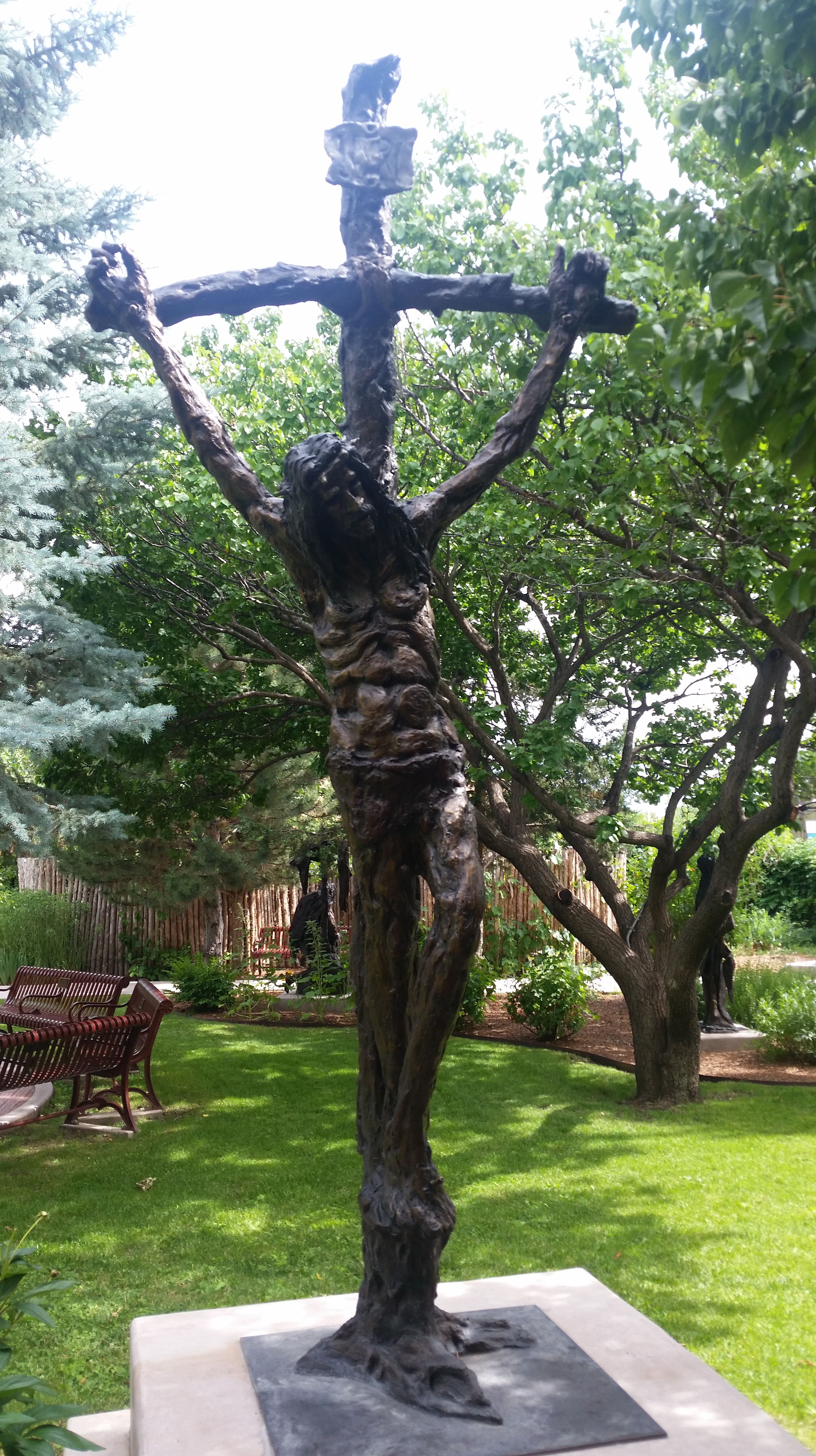 I spent the fourth of July strolling through old town Santa Fe with about a million other people. Place was packed! filled with artists selling their work and a bandstand right in the middle of the plaza with four old folks playing strings. A guitar,mandolin,bass and a fiddle, playing Blue Grass and though I’ve never been a fan it was captivating and sweet and I sat and listened and tapped my feet and watched the most fascinating thing on earth. Humans. Of every sort. A woman got up and started dancing and I thought, “there’s one in every crowd”. I watched her face as she freestyled around the foot of the stage and was transfixed by the pure joy on her face, in her hands and feet and knees. She was rapturous. I went and sat next to her and we talked about how beautiful it all was. I drifted through the crowd, had a martini at a bar and then went to church. The cathedral of Saint Francis of Assisi where I walked and sat in the Stations of the Cross Prayer garden. Beauty and horror planted there side by side. Blooming roses and lavender and Jesus on the cross.