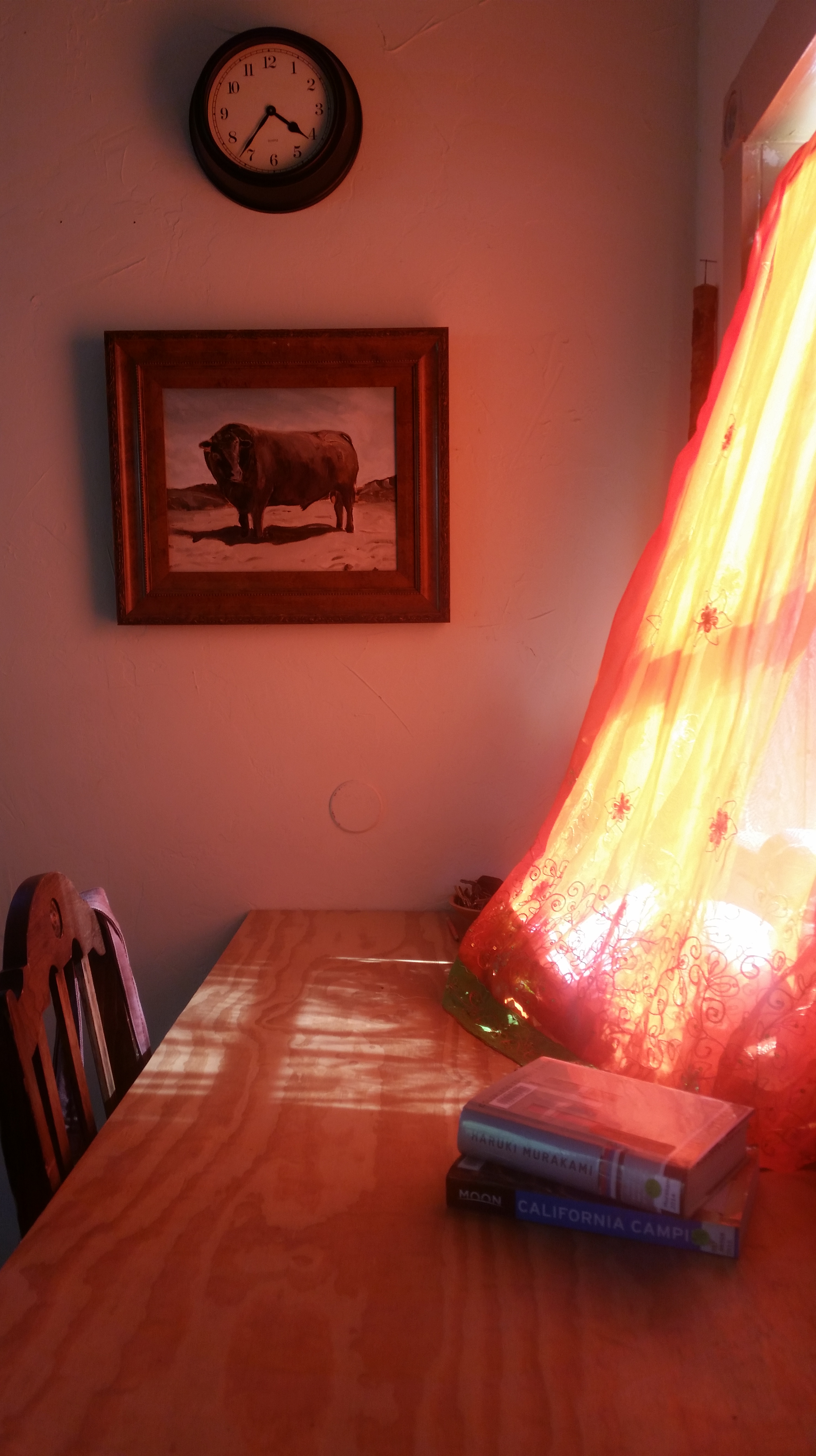 4. The clock on the wall hands pointing to the cow in the painting below that is looking at the billowed curtain bespeckled with flowers that resemble floating spiders aglow in a late day sun that casts shadows on the table the resemble delicate lacey webs is just about the most beautifully zenny image I’ve ever laid eyes on. Forgive me my run on sentence. But my oh my that image does run on.