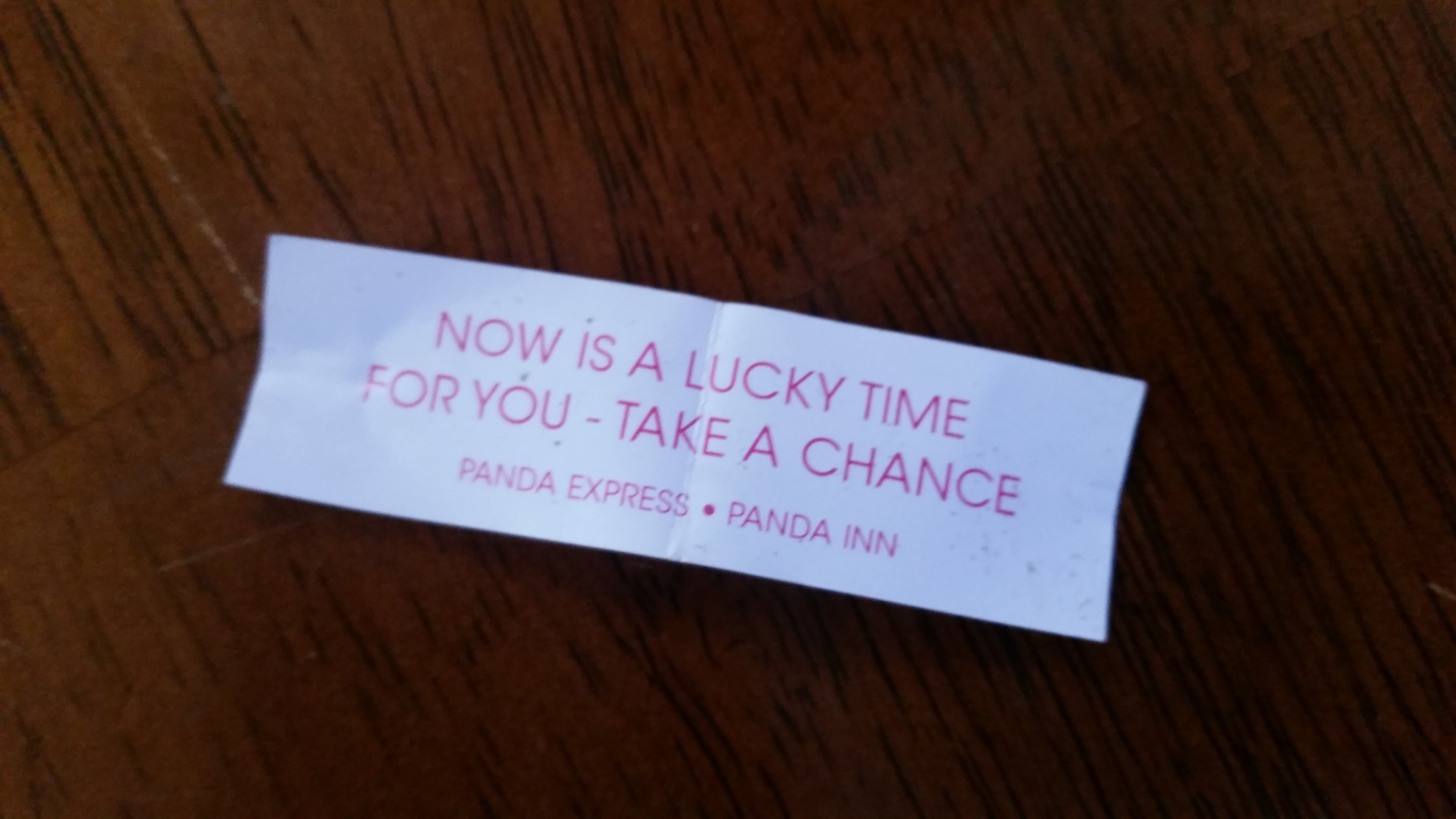 On my way home I stopped for lunch at Panda Express. You might think the eggplant and tofu with a bowl of brown rice a healthy and tasty choice if you’re that kind of crazy. I don’t recommend it, it was about as tasty as soggy cardboard. But.My fortune cookie clinched the deal when I was trying to decide which way to head home with a misbehaving van.